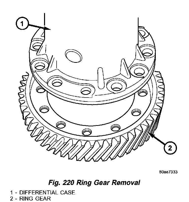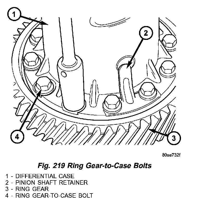 8. Remove ring gear-to-differential case bolts and floating pinion shaft retainers (Fig. 219).