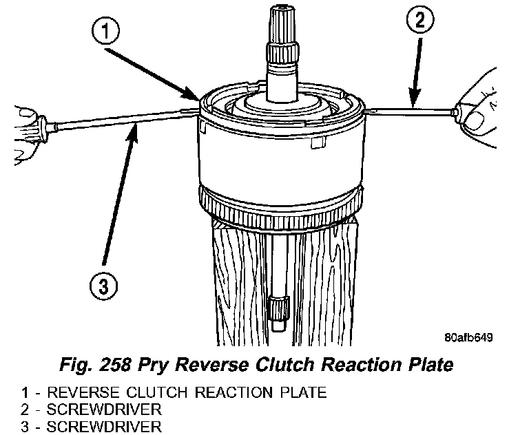 4. Pry up and remove reverse clutch reaction plate (1) (Fig. 258).