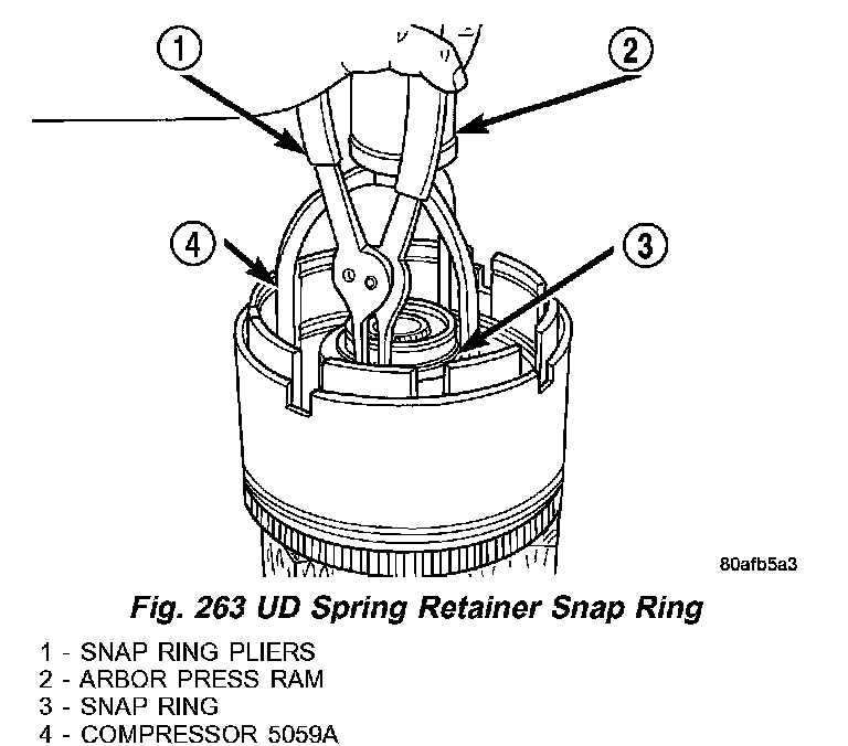 13. Using compressor 5059A (4) (Fig. 263) and an arbor press (2), compress UD clutch piston/spring enough to remove snap ring (3).