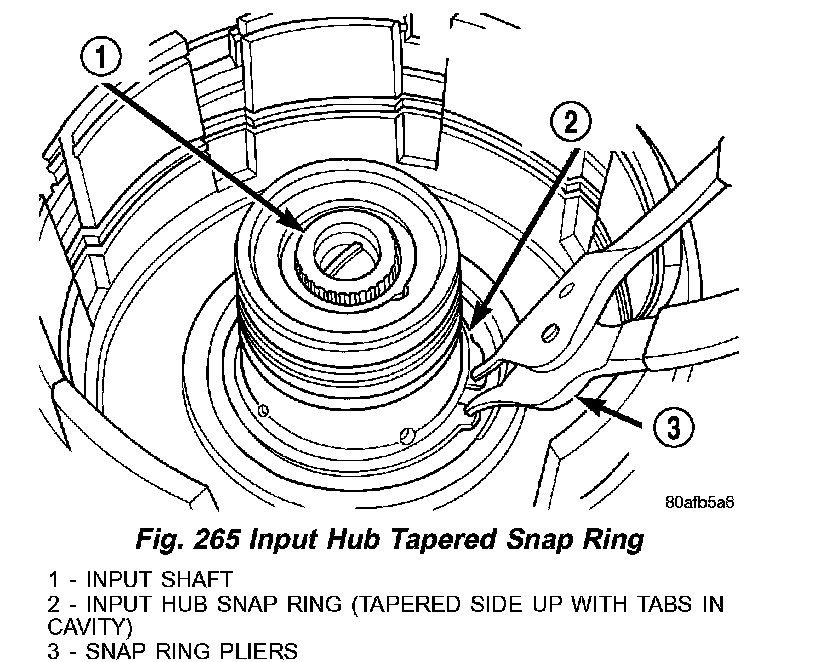 16. Remove input hub tapered snap ring (2) (Fig. 265).