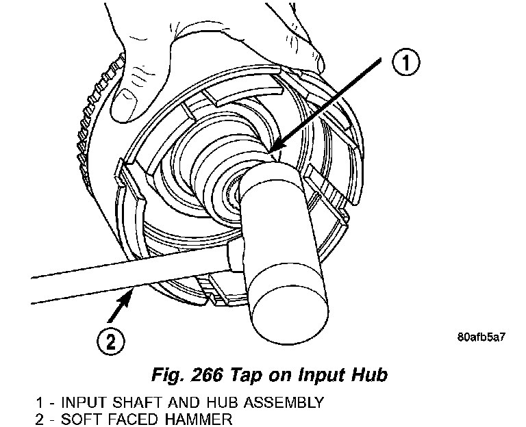 17. Tap on input hub with soft faced hammer (2) (Fig. 266) and separate input hub from OD/Reverse piston and clutch retainer.