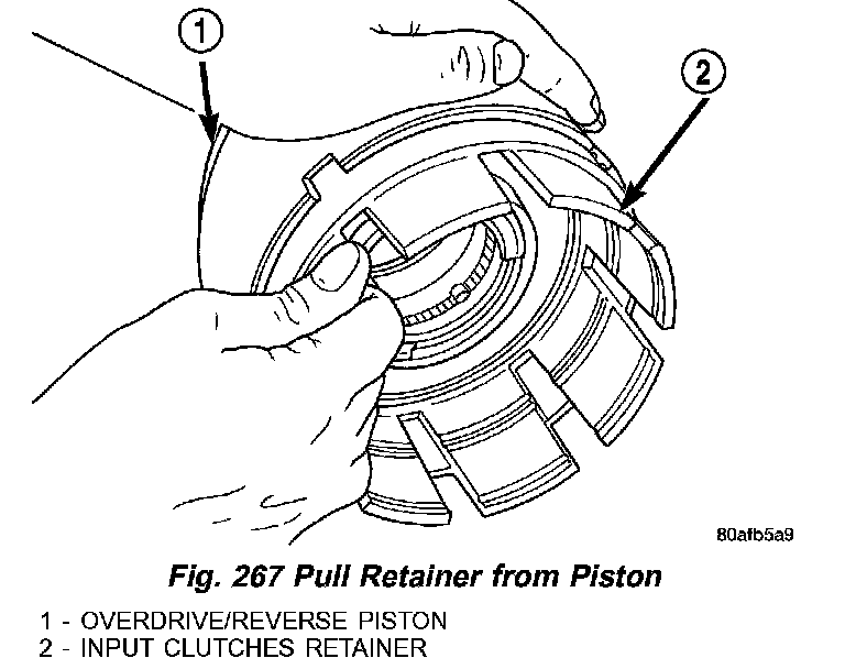 18. Separate clutch retainer (2) (Fig. 267) from OD/Reverse piston (1).