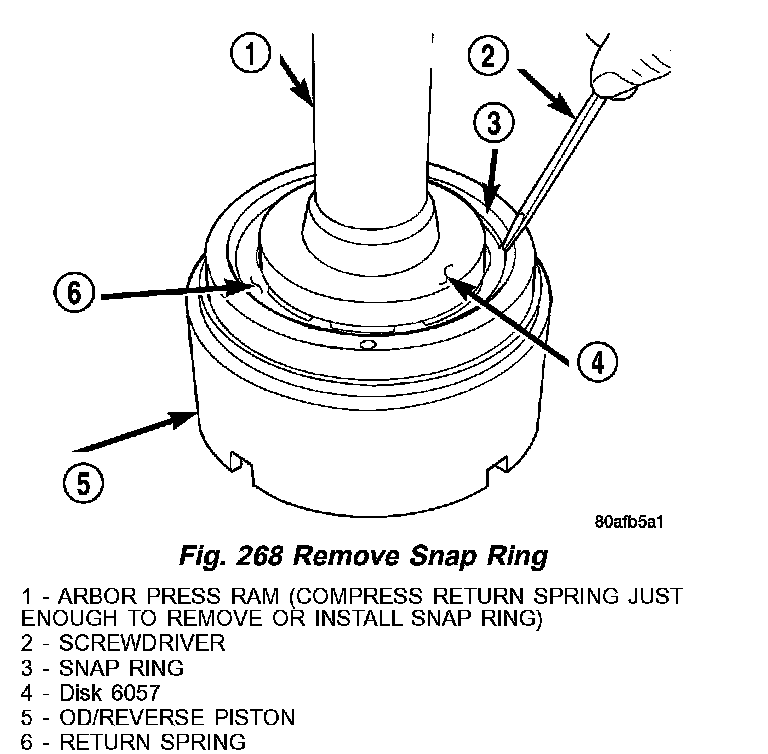 19. Using Disk 6057 (4) (Fig. 268) and an arbor press (1), compress return OD/Reverse piston return spring just enough to remove snap ring (3).