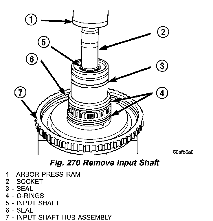 21. Using a suitably sized socket (2) (Fig. 270) and an arbor press (1), remove input shaft (5) from input shaft hub (7).