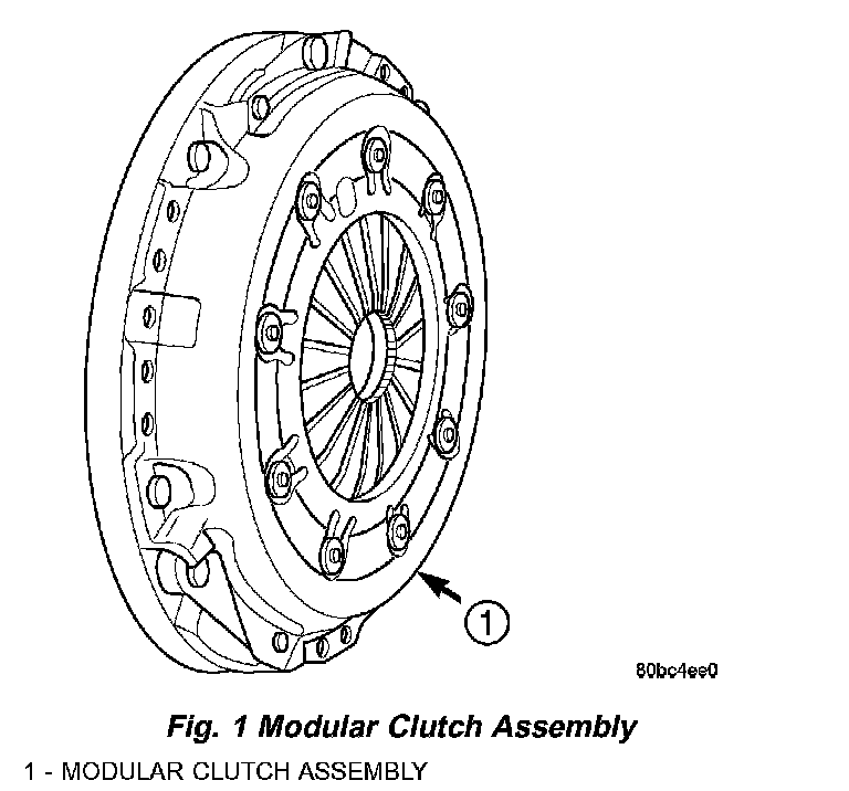 Manual transaxle equipped models utilize a modular clutch assembly. The clutch system consists of a modular clutch assembly (Fig. 1), a sleeve type release bearing, a self adjusting clutch cable, and a clutch pedal that is part of a brake/clutch pedal bracket assembly.