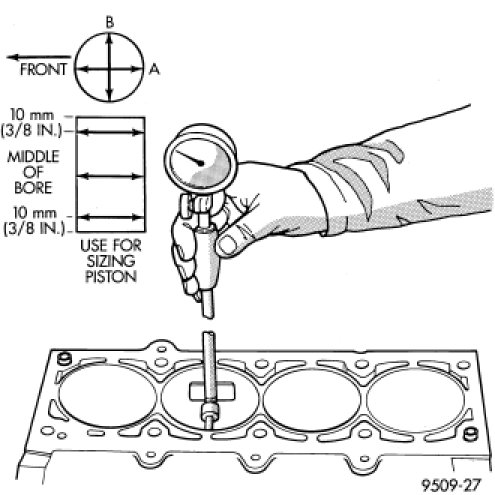 Measure the cylinder bore at three levels in directions A and B. Top measurement should be 10 mm (3/8 in.) down and bottom measurement should be 10 mm (3/8 in.) up from bottom of bore.