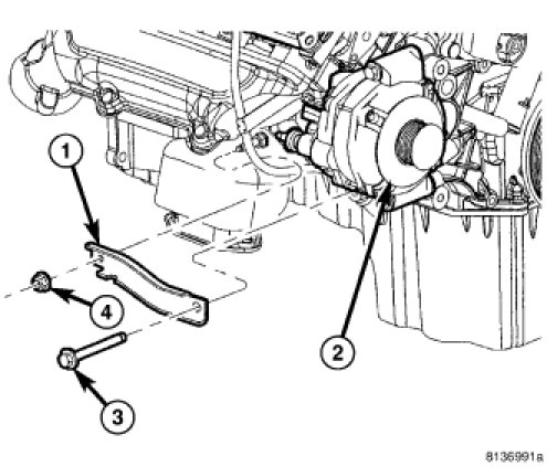 3. Position support bracket (1) to generator and install bolt (3) and nut (4). Tighten bolt / nut. Refer to Torque Specifications.