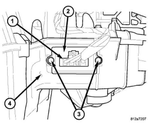 1. Position the blower motor resistor (2) into the front HVAC housing (4).