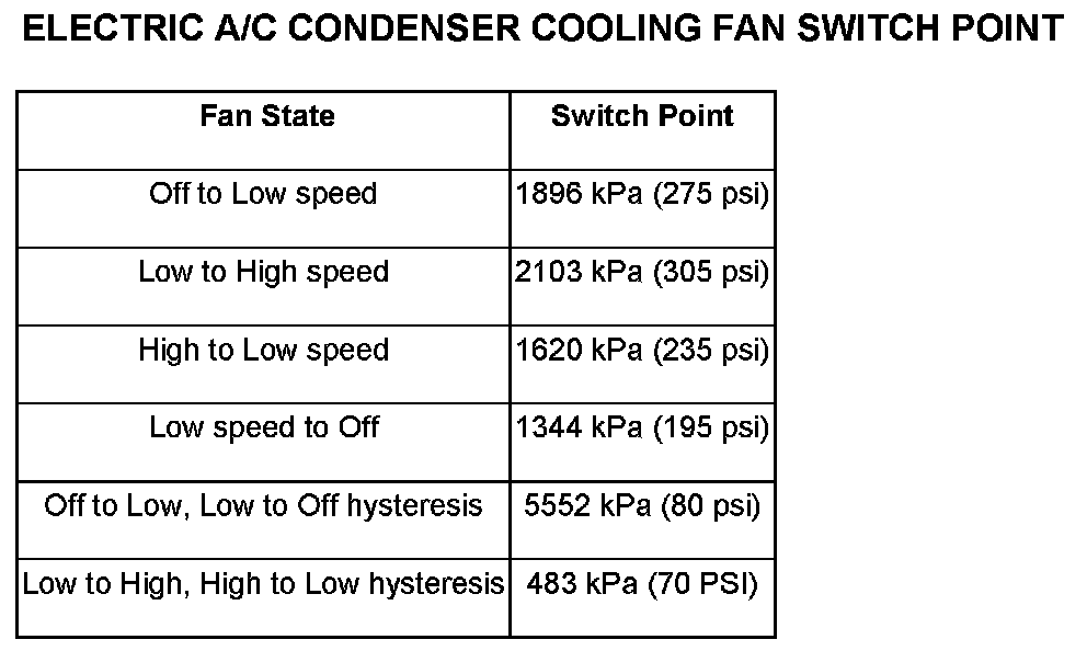 The front control module (FCM) provides a five volt reference signal to the A/C pressure transducer, then monitors the output voltage of the A/C pressure transducer on a sensor return circuit to determine refrigerant pressure. The FCM broadcasts a refrigerant pressure message to the PCM, which is programmed to respond to the A/C pressure transducer and other sensor inputs by controlling the operation of the A/C compressor clutch and the radiator cooling fan to help optimize A/C system performance and to protect the system components from damage. The PCM will disengage the A/C compressor clutch when high side pressure rises above 3275 kPa (475 psi) and re-engage the clutch when high side pressure drops below 1999 kPa (290 psi). The A/C pressure transducer will also disengage the A/C compressor clutch if the high side pressure drops below 193 kPa (28 psi) and will re-engage the clutch when the high side pressure rises above 234 kPa (34 psi). If the refrigerant pressure rises above 1655 kPa (240 psi), the PCM will actuate the cooling fan. The A/C pressure transducer message to the PCM will also prevent the A/C compressor clutch from engaging when ambient temperatures are below about 4.5° C (40° F) due to the pressure/temperature relationship of the refrigerant. Refer to the Electric A/C Condenser Cooling Fan Switch Point chart for condenser cooling fan on/off pressures.