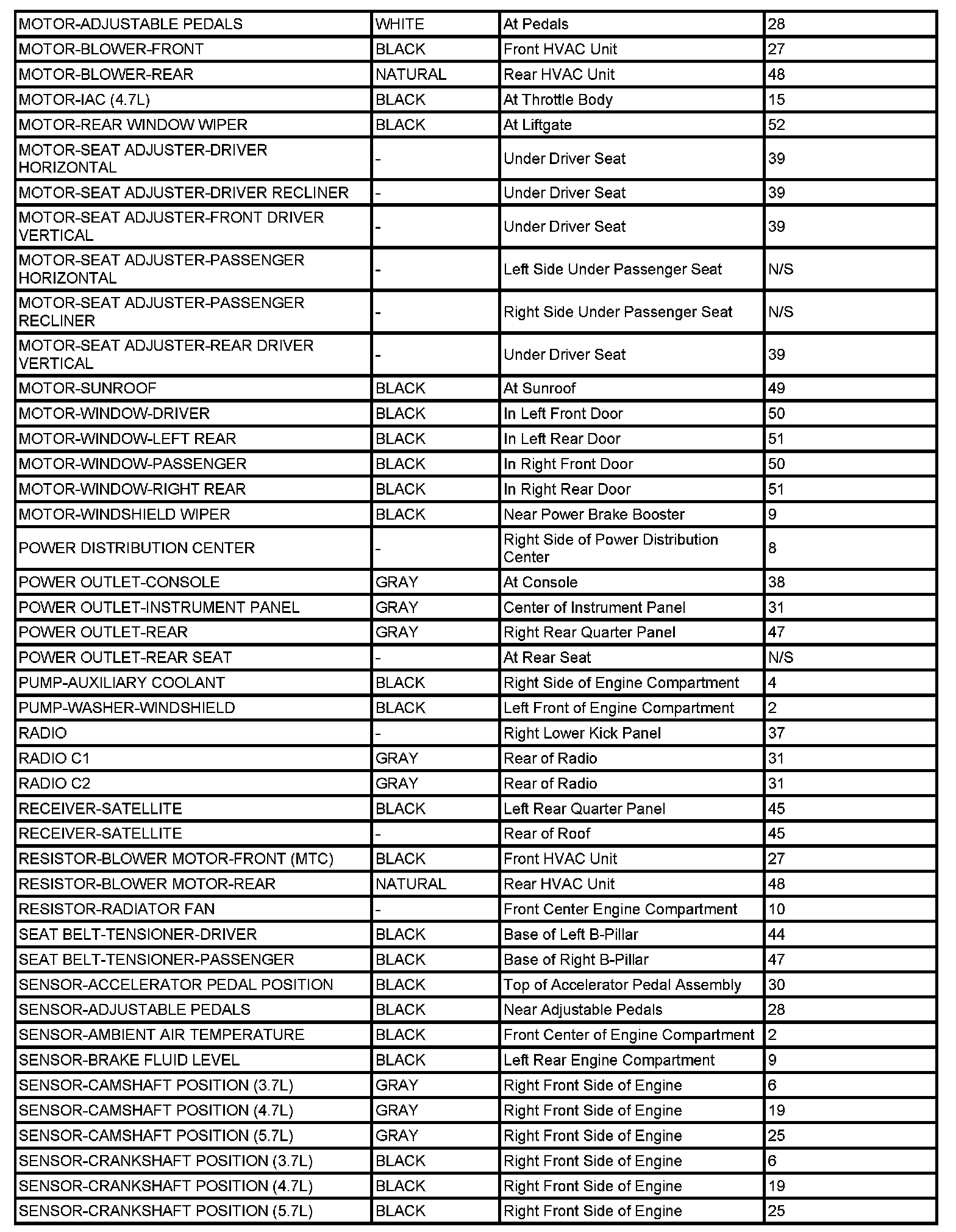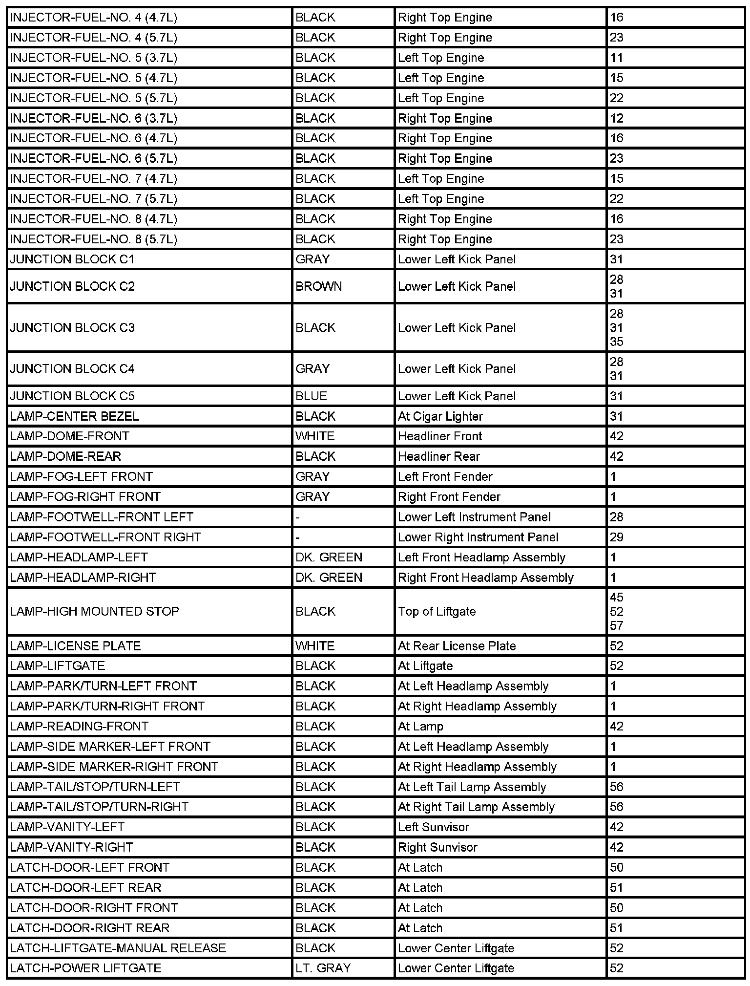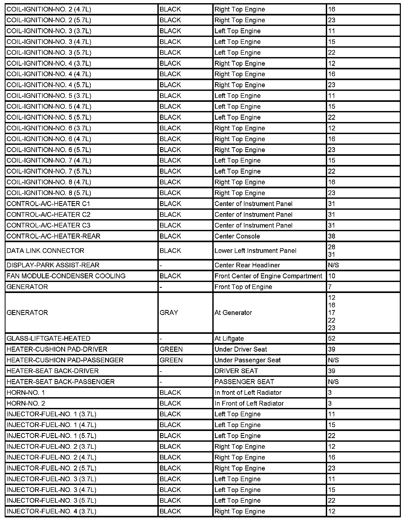 The abbreviation T/O (Take Out) is used in the location column to indicate a point in which the wiring harness branches out to a component.
