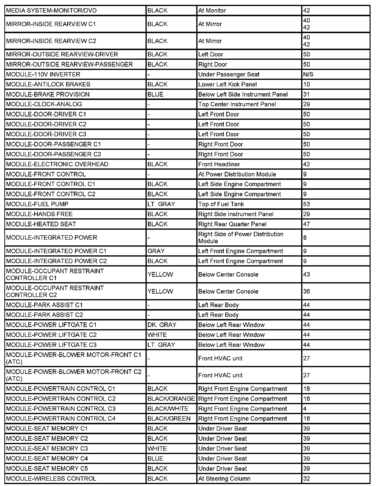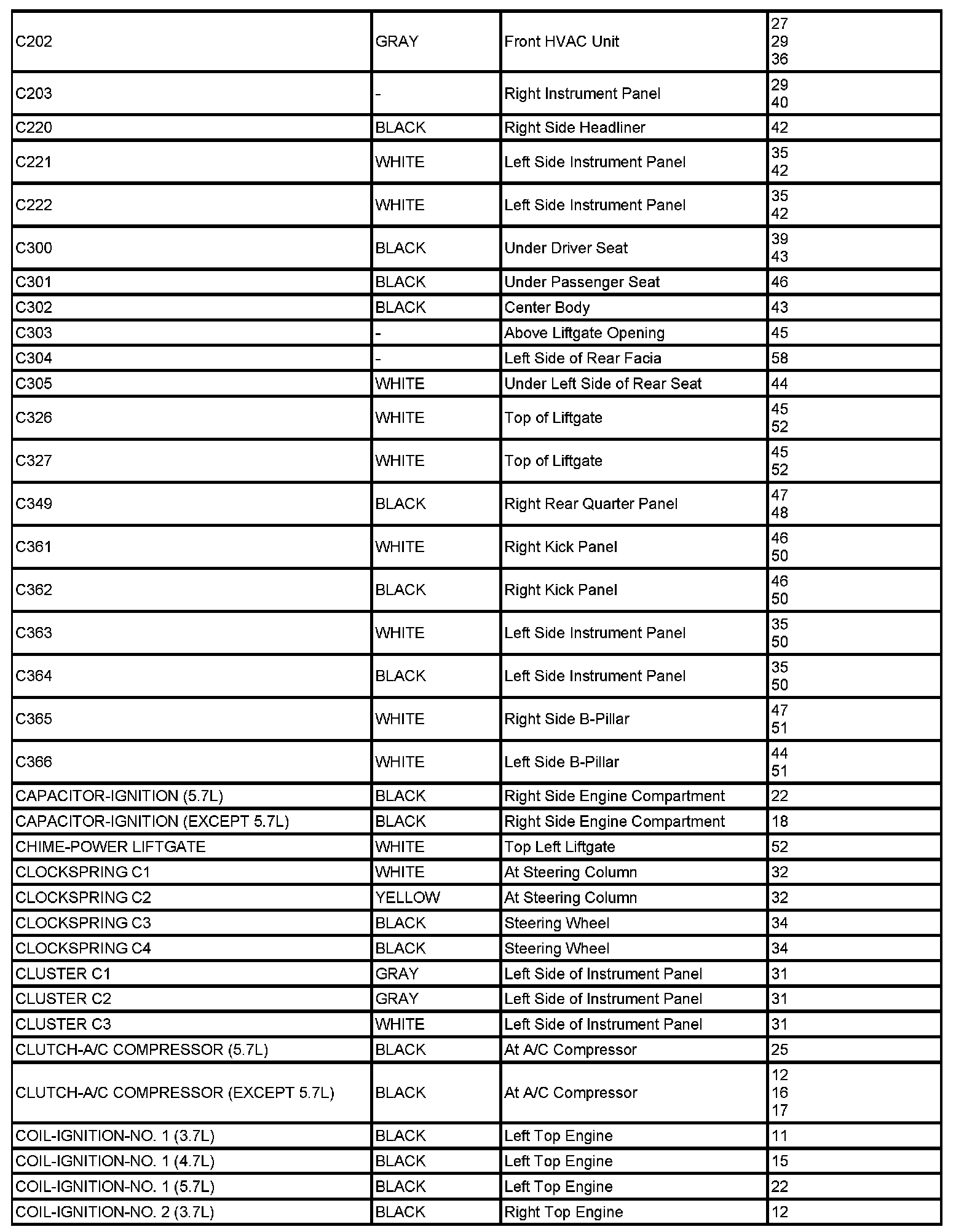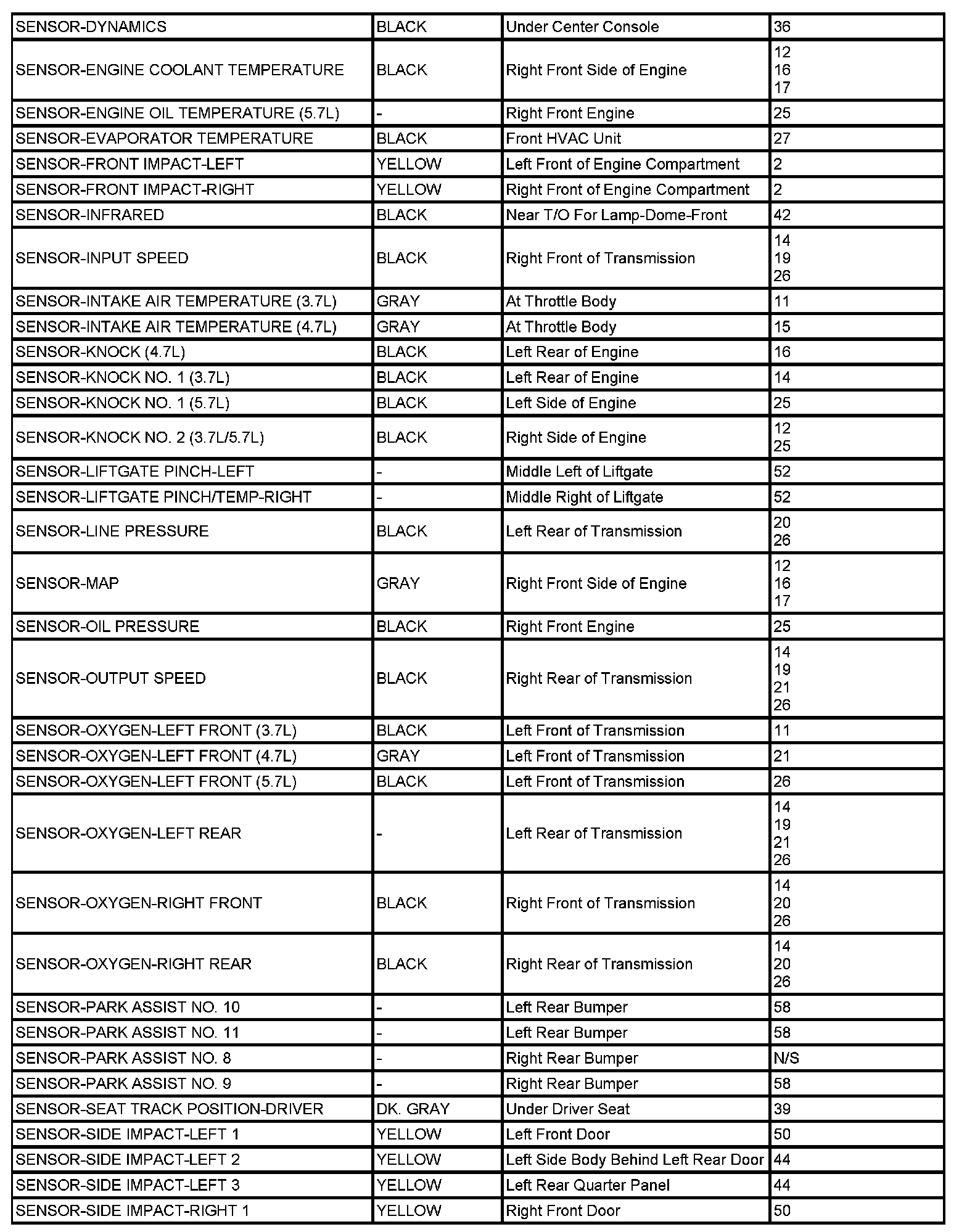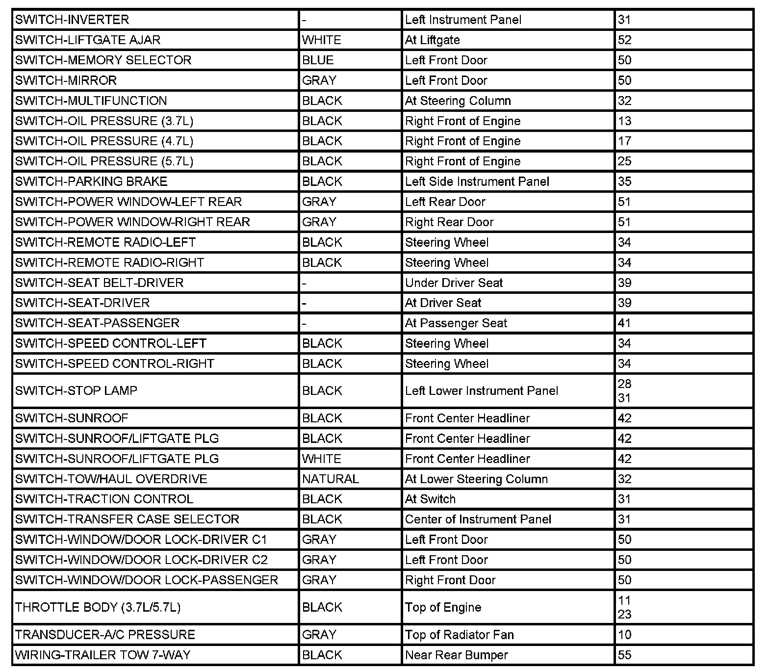 The abbreviation T/O (Take Out) is used in the location column to indicate a point in which the wiring harness branches out to a component.
