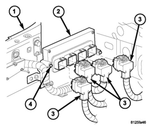 7. Remove three PCM mounting bolts (4), and remove PCM from vehicle.
