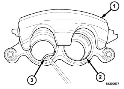 10. Push caliper mounting bolt bushings (3) out of the boot seals (2) and remove the boot seals from the caliper (1).