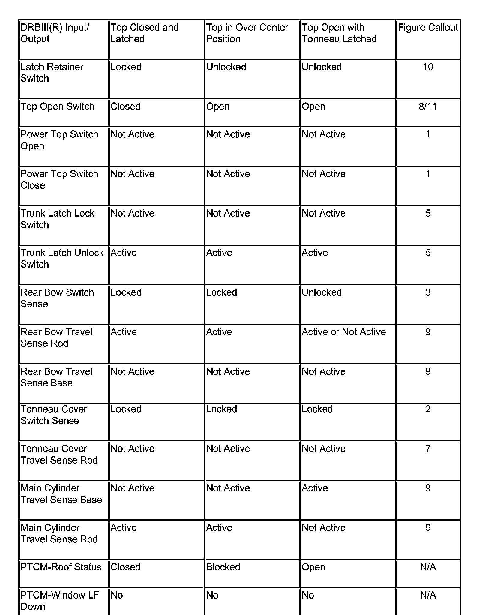 CONVERTIBLE TOP DRBIII(R) INPUT/OUTPUT STATES (NORMAL OPERATION):