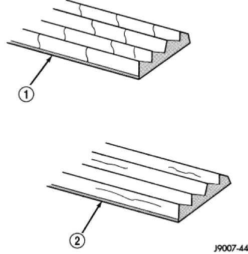 The accessory drive belt may develop minor cracks across the ribbed side (1) due to reverse bending. These minor cracks are considered normal and acceptable. Parallel cracks (2) are not considered normal and should be cause for belt replacement.
