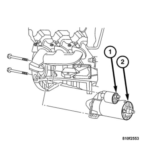 The starter motor (2) is mounted with two bolts to the transmission housing and is located on the right side of the engine. The starter motor incorporates several features to create a reliable, efficient, compact, lightweight and powerful unit. The electric motor of the starter features electromagnetic field coils wound around pole shoes, and brushes contact the motor commutator. The starter motor is serviced only as a unit and cannot be repaired. The entire starter motor (2) and starter solenoid unit (1) must be replaced if either component is faulty or damaged.