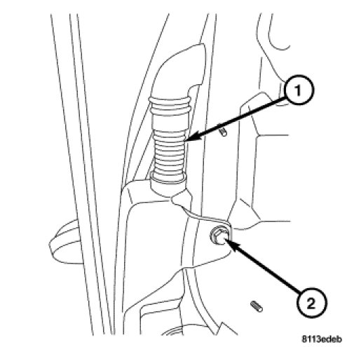 2. Install the washer fluid filler tube (1) to the washer reservoir.