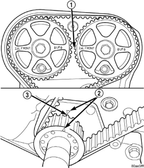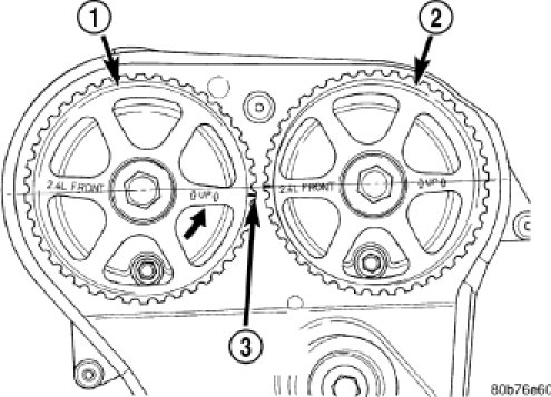 ^ Set camshafts timing marks so that the exhaust camshaft sprocket (1) is a 1/2 notch (3) below the intake camshaft sprocket (2).