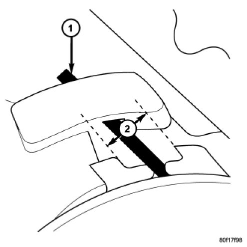 ^ Check if the spring tang (1) is within the tolerance window (2). If the spring tang (1) is within the tolerance window (2), the installation process is complete and nothing further is required. If the spring tang (1) is not within the tolerance window (2), repeat Steps 5 through 7.