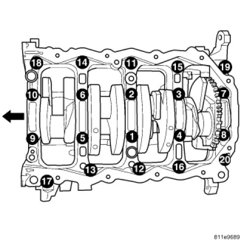 - Install main bearing cap/bed plate to engine block bolts 11, 17, and 20 finger tight. Tighten these bolts down together until the bed plate contacts the cylinder block.