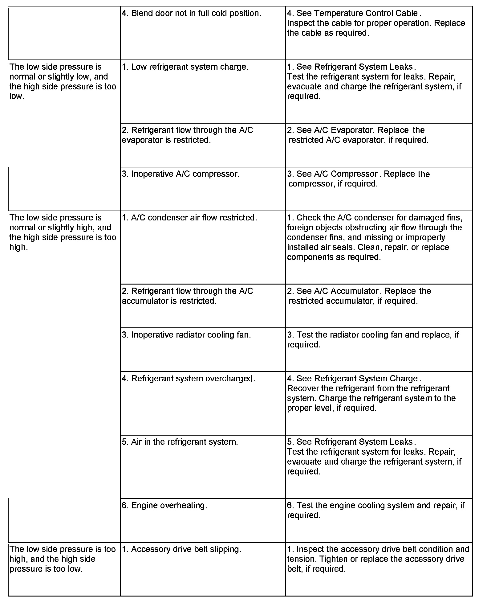 6. If the air outlet temperature fails to meet the specifications in the A/C Performance Temperature and Pressure chart, or if the A/C compressor discharge pressure is high, refer to the A/C System Diagnosis chart.