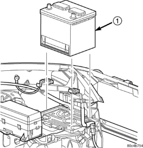 14. Install the battery (1) and hold down clamp.