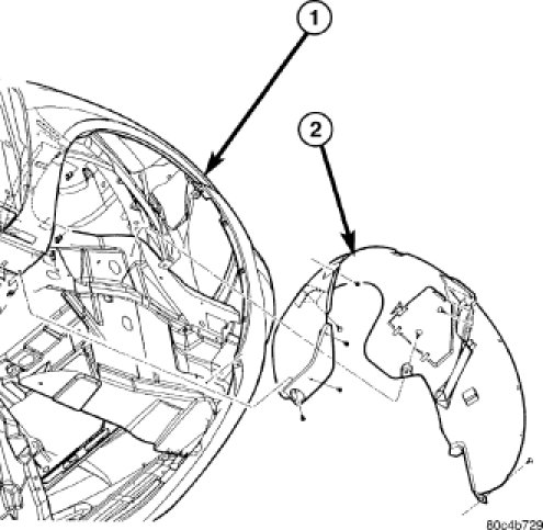 1. Position the front wheelhouse splash shield (2) to the vehicle.