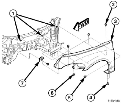 6. Install the two bolts (4) that secure the bottom of the front fender to the lower rocker panel.