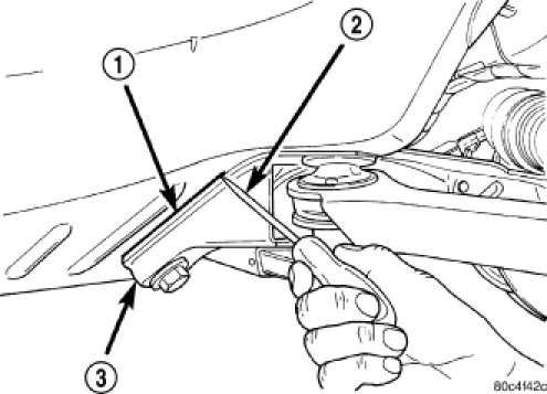 4. Using a soft face hammer, tap the front suspension crossmember back-and-forth or side-to-side until it is aligned with the previously scribed positioning marks (1) on the body of the vehicle. Once the front suspension crossmember is correctly positioned, tighten the two crossmember mounting bolts through the lower control arm rear isolator bushings to a torque of 250 Nm (185 ft. lbs.), then tighten the four remaining crossmember mounting bolts to a torque of 153 Nm (120 ft. lbs.).