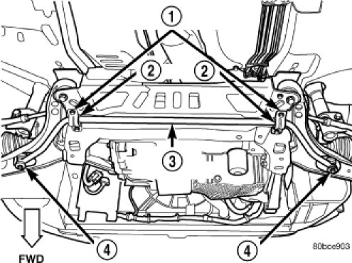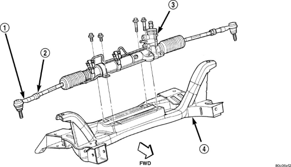 7. Attach the steering gear (3) to the front suspension crossmember (4). Install the four power steering gear mounting bolts. Tighten the mounting bolts to a torque of 61 Nm (45 ft. lbs.).
