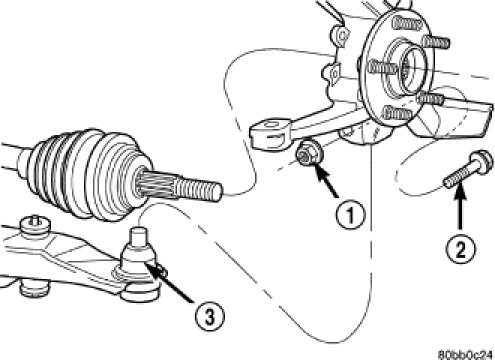 9. Install each ball joint stud into the steering knuckle aligning the bolt hole in the knuckle boss with the notch formed in the side of the ball joint stud.