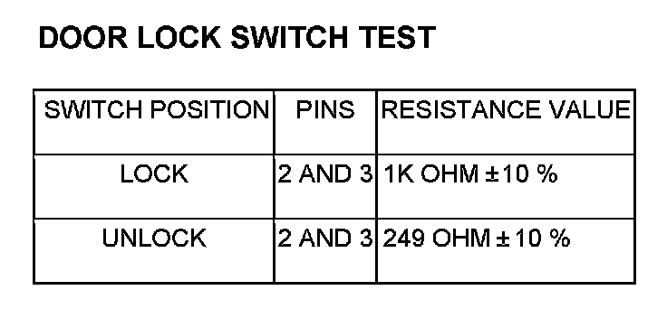 2. Using an ohmmeter, refer to Door Lock Switch Test table to determine if switch resistance is correct in the Lock and Unlock switch positions. Refer to Wiring Diagrams for harness connector pin-outs.