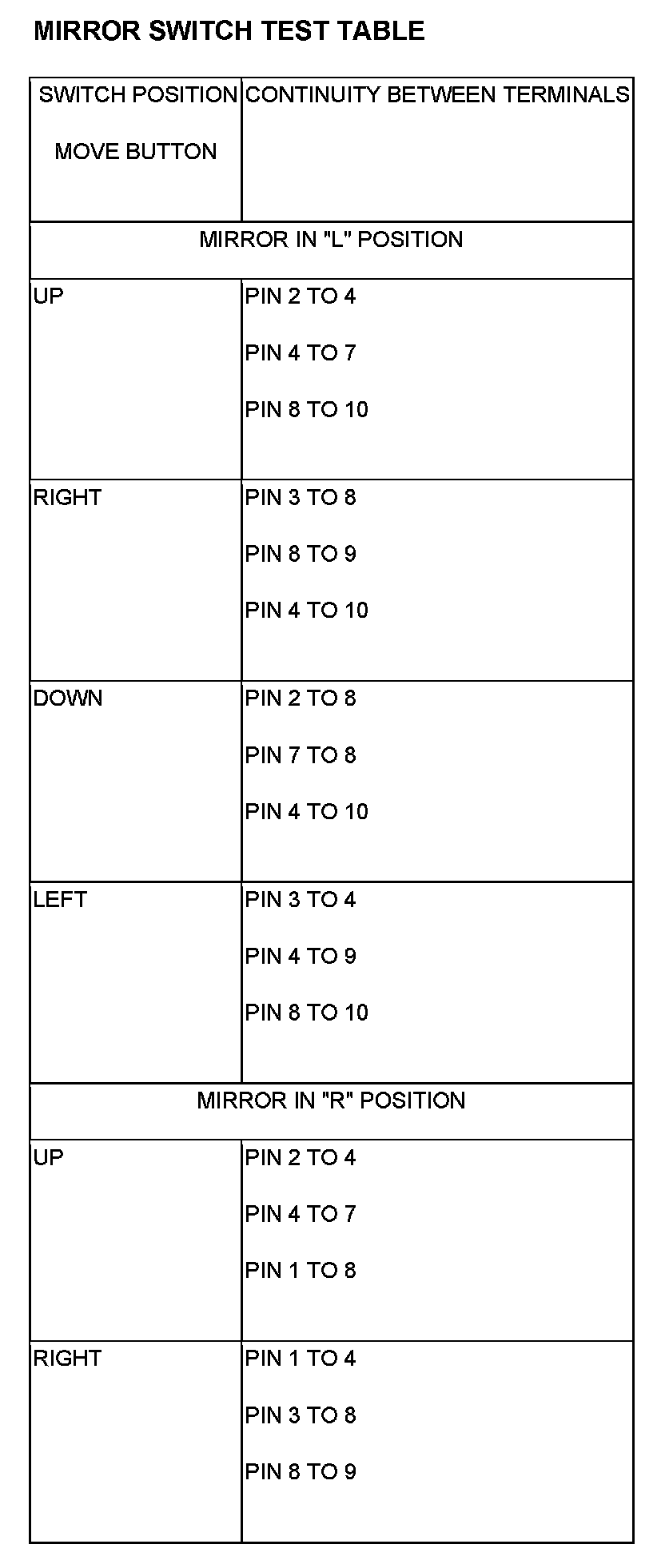 3. Using an ohmmeter, test for continuity between the terminals of the switch as shown in the Mirror Switch Test table.
