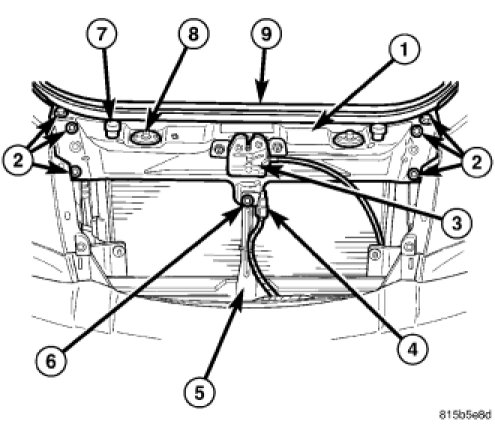2. Install the six bolts (2) that secure the upper radiator support to the fenders. Tighten the bolts securely.