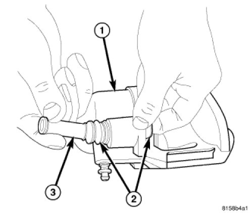 1. Push the guide pin bushing sleeve (3) towards the back of the caliper (1), then pull the sleeve out the back of the caliper bushing (2).