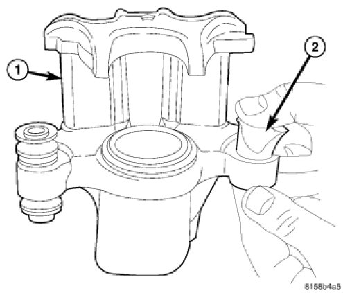 2. Once the sleeve is removed, collapse one side of the rubber guide pin bushing (2). Pull the bushing out the opposite side of the brake caliper (1) mounting boss.