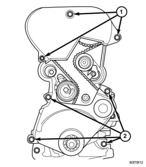 1. Install rear timing belt cover and fasteners (1, 2). Torque fasteners to values specified in