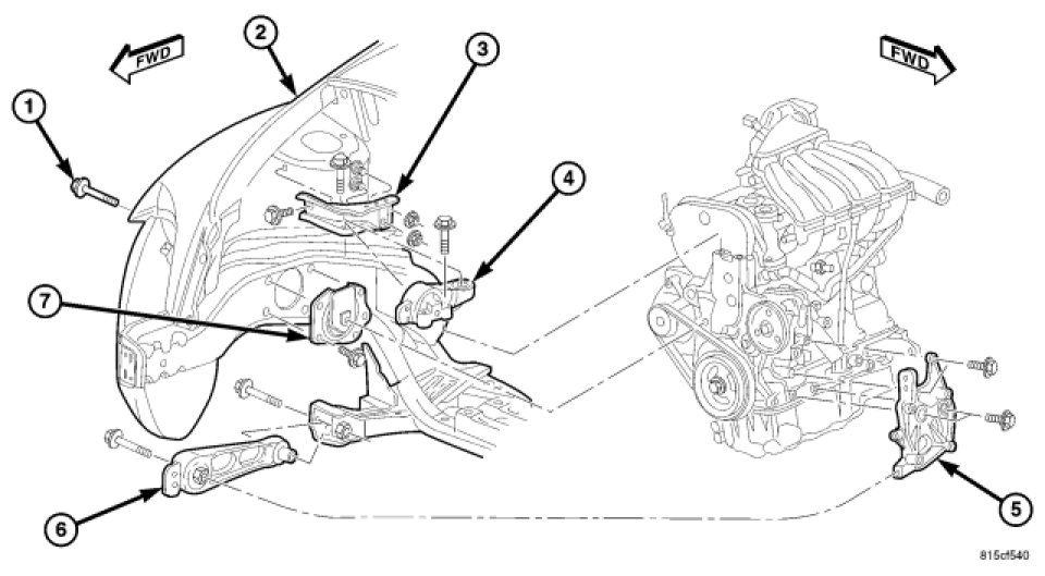 3. Lower engine into mounting position and install right engine mount through bolt (1). Tighten bolt to 118 Nm (87 ft. lbs.).