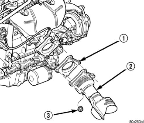 2. Install right engine support bracket (1). Ensure the power steering pump is properly located in mounting location on bracket. Tighten mount bracket bolts (2) to 61 Nm (45 ft. lbs.).