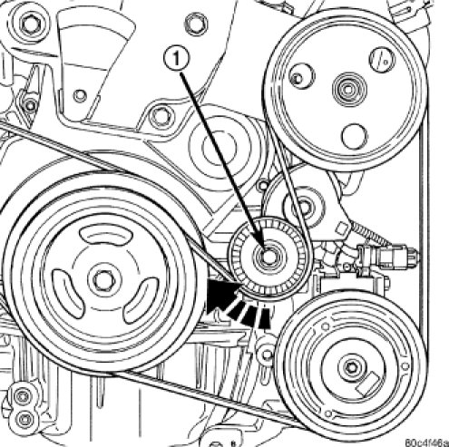 2. Install timing belt idler pulley (1). Tighten timing belt idler pulley fastener (2) to 61 Nm (45 ft. lbs.).