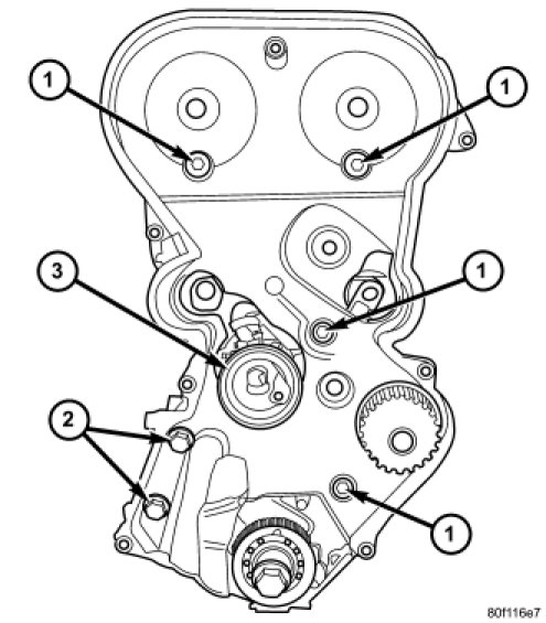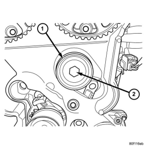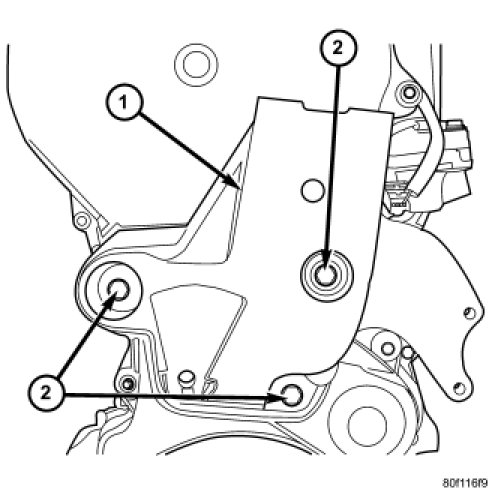 19. Remove timing belt cover fasteners (1, 2) and remove cover.