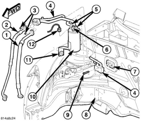 4. Engage the accumulator mounting bracket onto the rubber grommet (11) located on the right frame rail (8) by pushing straight downward on the A/C accumulator (10).