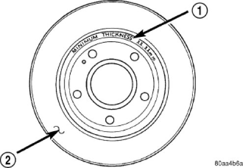 Minimum thickness specifications are cast on the rotor's unmachined surface (1). Limits can also be found in this component's specification table.
