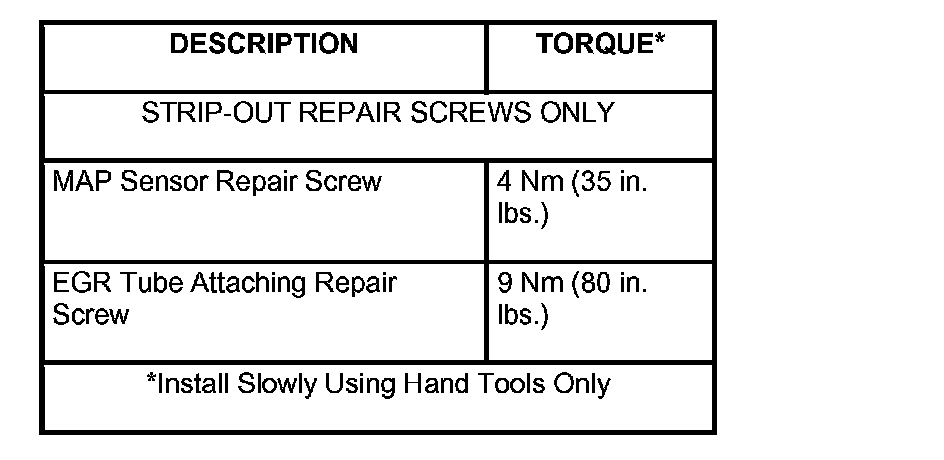 The composite upper intake manifold thread bosses, if stripped out, can be repaired by utilizing a repair screw available through Mopar(R) parts. Repair screws are available for the following manifold attached components: