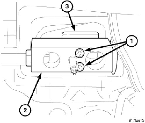 3. Position the A/C expansion valve (3) onto the evaporator tube tapping plate (3) and install the two retaining bolts (1). Tighten the bolts to 11 Nm (97 in. lbs.).
