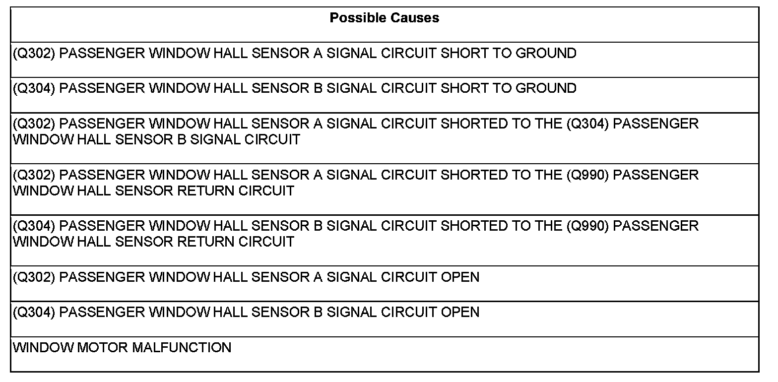- Repair the (Q302) Passenger Window Hall Sensor A Signal circuit for a short to the (Q990) Passenger Window Hall Sensor Return circuit.