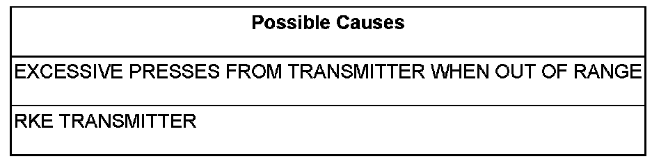 NOTE: The most probable cause for this code to set is if the Wireless Control Module (WCM) senses over 150 presses from the RKE transmitter, when it is out of range.