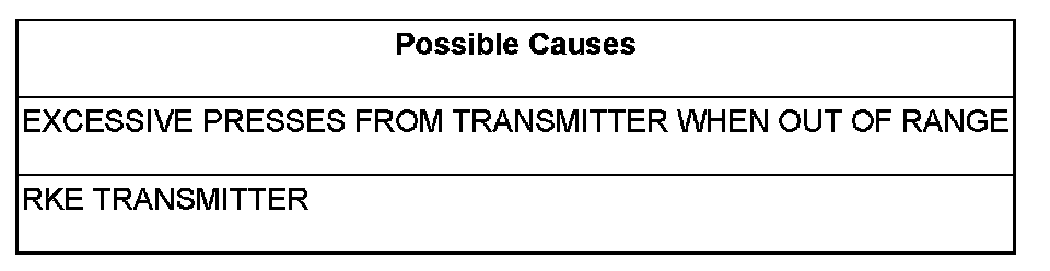 NOTE: The most probable cause for this code to set is if the Wireless Control Module (WCM) senses over 150 presses from the RKE transmitter, when it is out of range.