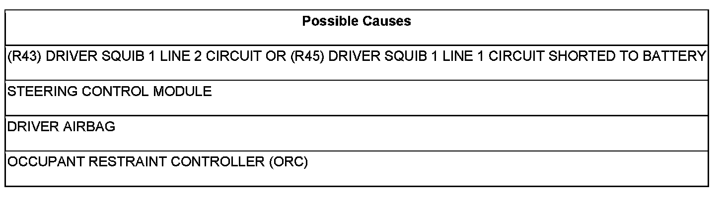 4.CHECK (R43) DRIVER SQUIB 1 LINE 2 CIRCUIT AND (R45) DRIVER SQUIB 1 LINE 1 CIRCUIT FOR A SHORT TO BATTERY
