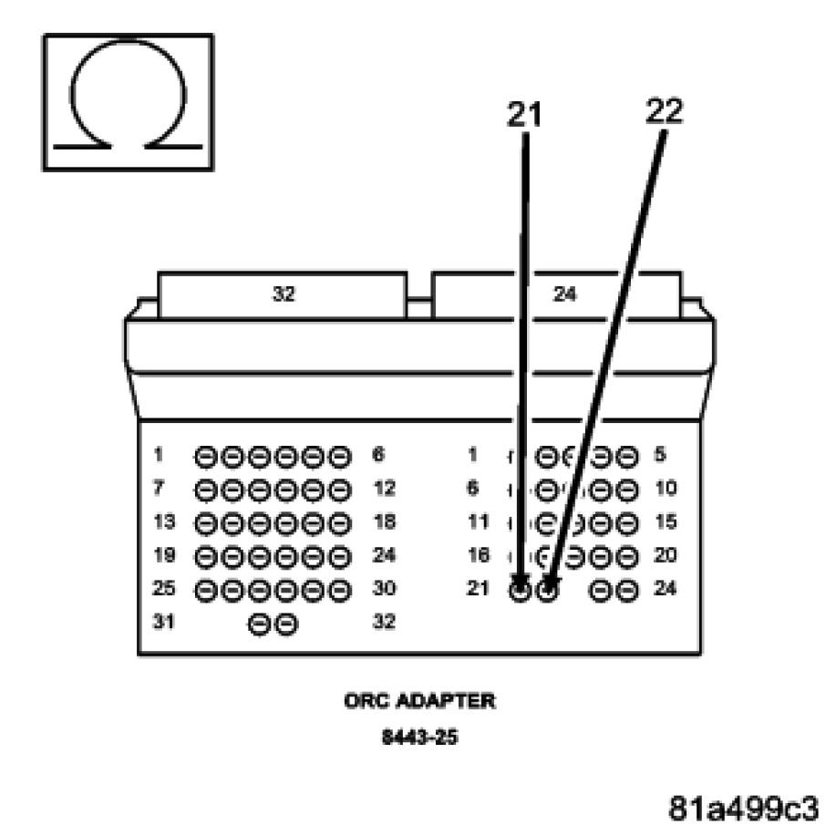 Measure the resistance between the (R63) Driver Squib 2 Line 1 circuit and the (R61) Driver Squib 2 Line 2 circuit at the ORC 8443-25 Adaptor cavities 24-22 and 24-21.